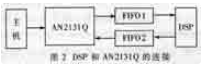 由于AN2131Q芯片内嵌8位8051处理器,所以使用两片8位FIFO芯片实现USB接口和DSP之间的双向通信。FIFO选用具有1K×9bit内存的IDT72V02。从AN2131Q或者DSP传输的数据首先保存在FIFO中,然后再由DSP或者AN2131Q读走,从而使得数据的传输不会出现堵塞情况,其硬件连接框图如图2所示。