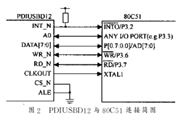 图2所示是采用了1个80C51的微控制器与PDIUSBDl2集成电路相互连接的简图。由于80C51是应用比较广泛的一种单片机微控制器,,软件开发工作者在其基础上开发大量的软件开发平台,大多数电子工程师对其的原因都比较熟悉。因此,用户可以利用比较熟悉的微处理器(80C51)进行核心程序的设计,即用80C51来实现其所需的功能,具体将数据信号转换为符合USB规则的信号,则完全由PDIUSBDl2来完成。这样以来,既可以利用80C51中丰富的软件资源,又可以利用USB总线技术的即插即用、热插拔等特性,可以使开发设备的成本降低、缩短开发产品的时间周期。