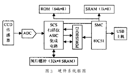 图3所示是利用PDIUSBDl2和1块80C51微处理器构成的硬件系统框图,他是将一个符合SCSI标准的扫描仪转换变成一个USB总线规范的设备,该方案对现有硬件进行最小改动的情况下达到了USB接口技术的实现。