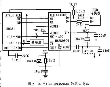 图2所示是89C51单片机和USBN9604的接口电路,该电路由一片89C51单片机、USBN9604、时钟振荡电路以及相应的外围电路组成。其中USBN9604通过外部中断INT0与89C51单片机进行通信。