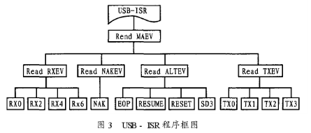 设备固件是设备运行的核心,可采用C语言设计。其主要功能是控制USBN9604接受并处理USB驱动程序的请求(如各种标准请求)、接收/_k传数据。当主程序完成CPU和USBN9604的初始化后,可用while循环等待外部中断。中断处理程序可在给出中断人口后跳出中断。所有的USB事物处理都在函数USB-ISR中完成。图3所示是USB-ISR程序框图。在USB-ISR中,通过程序可读取USBN9604中的主事件寄存器(MAEV),并判断中断原因,包括收发事件的发生、总线状态的改变以及握手信号的产生等,同时可根据不同原因进入相应函数。另外也可通过函数具体实现各种USB标准的请求、端点0的接收和发送以及其它端点的收发和总线状态的改变等。