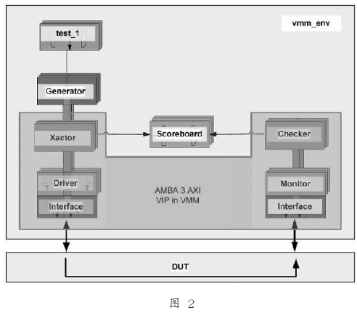 最重要的一点是,AXI-VIP提供与VMM平台的接口。实际上,这个VIP本身就实现了VMM平台的驱动部件(Driver)加监控部件(Monitor)的功能:向下层是与DUT通过端口相联,向上层则有基于vmm-channel/vmm_xactor_callbacks的数据传输管道。如图2所示,除Test、Generator、和Scoreboard之外的部分,AXI-VIP都已实现。