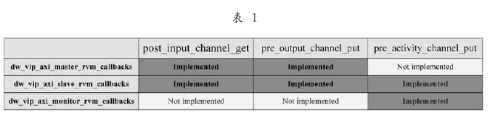 AXI-VIP包括主设备、从设备、与监控设备。它们在数据交易的几个关键点将得到一次函数回调(callback)的机会,如表1所示。