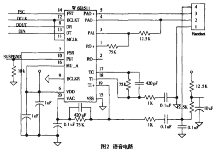 IP电话的原理图如图1所示。它由Tiger560B和W681511及其外围设备和接口组成。主要电路有:语音电路、LCD显示电路、键盘电路。