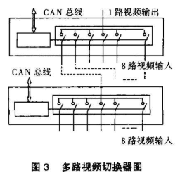 为了满足大尺寸物体的视觉检测需要,充分利用CAN 总线的特点,使整个控制系统具有积木式的可扩充能力,本控制系统按最少能带64 个传感器的负载能力进行了设计。如果设每个视觉传感器里面都有两个摄像机,即最多共有128 路视频输入,而任一时刻系统只选取其中一路视频图像传给计算机图像采集卡进行图像采集处理,因此在图2 每个视觉传感器的单路视频输出处,需再加上一个多路视频切换器,如图3 所示,每8 个视频输入1 路视频输出作为一个视频信号切换单元,实现8 选1 方式的视频切换。那么按图3 中的积木式连接方式,9 个单元就可驱动64 路传感器。每个视频切换单元都有自己的CAN 总线接口,连接到整个控制系统的分布式网路上,与单个传感器控制系统一起协同工作。我们采用8 选1 视频切换为一个单元,采用积木式结构进行扩充,主要是考虑到在实际的多视觉传感器测量系统中,对于具体不同的测量对象,使用的传感器的数目可能不同。这种方式的最大优点是可以根据使用的传感器的多少进行自由组合。
