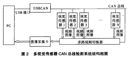 图2 给出了多视觉传感器CAN 总线网络控制检测系统的基本组成原理。本系统采用主从式结构,上位机为PC 机,下位机为8051 单片机控制单元(MCU) ,上、下位机之间用CAN 总线进行通讯,由于PC 机中并不带CAN 总线接口,因此需要一个CAN 接口卡,这里选用USBCAN 智能接口卡来通信,因其具有体积小、外置且即插即用等特点。这样,PC 可通过USB 总线方便地连接至CAN 总线网络,控制各个CAN 节点,进行数据采集和处理。