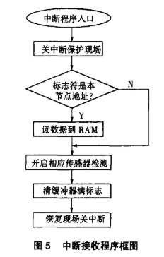 由于视觉传感器检测系统要进行的视觉检测任务多为在线检测,实时性要求较强,这里各传感器节点采用中断接收方式接收上位机的控制命令,节点初始化后,当收到上位机发出的一帧信息后,判断其报文标志符是否符合自己的接收代码寄存器和验收屏蔽寄存器的设置,若不符则不接收,若通过则确认为本节点应收信息后装入接收缓冲器,SJA1000 的INT 脚会产生中断信号,该信号连接到单片机P89C668 的外部中断0 引脚,在外部中断0中断处理程序执行如图5 所示的程序流程,读出接收缓冲器的数据并保存在RAM 中,并启动本视觉传感器节点进行测量。