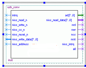 AVALON总线为用户提供了非常友好的接口,使得系统搭建时的一些细节问题得到屏蔽,大大减轻了系统搭建的工作量。在SL811HS与AVALON总线的接口转换verilog代码中,只需建立SL811HS端口与AVALON总线端口的映射关系即可。nios_intrq、nios_read_n、nios_write_n、nios_cs_n、nios_reset_n、nios_write_data[7..0]、nios_read_data[7..0]、nios_address分别对应NiosII中的中断、读、写、片选、复位、写数据、读数据、地址信号。intrq、nrd、nwr、ncs、nrst、ad[7..0]、a0分别对应SL811HS的中断、读、写、片选、复位、数据/地址线、数据/地址选择信号。如图3所示。