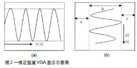 在二维的空间中显示一维矢量信号,常规显示方法可以是将一维信号从左至右显示,如图2(a)所示,就如在普通的示波器上观察到的一样。这样,在VGA显示时,一行扫过多个采样点,需把要显示的采样点位置计算出来,当行信号扫过时,把采样点的值赋给像素点,就完成了信号的显示。而对于连续的一维信号,因为行频比场频高,图2(b)的显示方法更加合理。为此,将一维信号的时间轴映射到垂直方向上,幅值映射到水平方向上,当行扫描信号扫过一行时,映射一维信号的一个采样点,即一行信号对应一个像素,当完成一行信号后接着回扫,开始扫下一行。一般情况下,场频确定后,就可以根据一维信号的频率确定出一场可以显示的周期数,当完成一场信号后,在屏幕上就显示一帧图像。