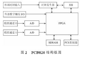 PCI9820 在数字设计方面,采用标准的SODIMMSDRAM来储存资料。因为PCI9820的单一信道所产生的数据流,已超过了33 MHz、32 b PCI总线的频宽,所以数据在传输到计算机之前都记录在板载SDRAM中,然后再通过总线控制DMA传输到主机内存中。当数据的速度超过PCI总线带宽时,板卡上的内存容量相对就显得重要。PCI9820的标准版本配备64 MB的内存,最高可支持到512 MB,可提供单一信道采集频率达130 MS/s时,长达数秒的储存空间。如果板卡的数据输出小于PCI带宽,PCI9820可以配置板载3k采样数量的FIFO旁路SDRAM,完成直达主机内存的实时数据传输。在一个多用户或者多任务操作系统中,单独分配一块大的连续的内存用于DMA传输是很困难的,所以PCI9820提供了聚散DMA功能,它能把分散的内存块连接成一个互连的表列,从而可以不受分散小容量内存块的影响实现大容量数据传输。其结构框图如图2所示。