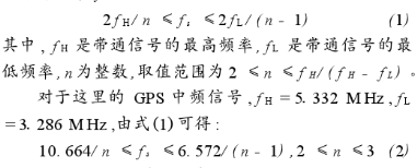 对于GPS中频带通信号,其带宽为B=2.046 MHz,只要取fs≥2B的某些值,就可以保证采样后的信号频谱不重叠。这种采样方式就称为带通采样(Band-Sampling),又叫欠采样(Under-Sampling),带通采样频率fs可由下式确定: