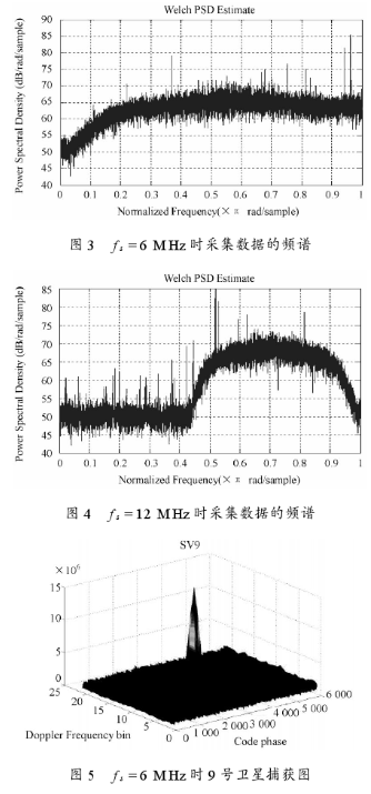 结果表明当采样频率为6 MHz和12 MHz时,数据连续可靠,为后续软件基带处理提供了真实可靠的数据。图3,图4分别为采样频率为6 MHz和12 MHz的信号频谱图,图5为以6 MHz进行采样的数据进行相关捕获运算,得到的9号卫星捕获结果图,表明数据完好可用。
