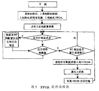 该部分采用VHDL语言编写,实现1553B总线数据的接收、发送、曼彻斯特II码、错误检出、奇偶检验、与DSP的接口和译码电路等功能。其中发送单元与接收单元是并行工作的,由逻辑门电路实现。这里从软件角度画出流程图如图5所示。
