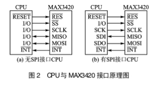 带有SPI接口的CPU,与MAX3420的接口十分方便;如果不带SPI接口,则也可用I/O口来实现SPI的功能。图2为CPU与MAX3420的接口原理图。