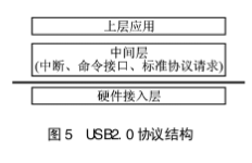 MAX3420共有4个端点,即EP0~EP3。其中:EP0为64字节的双向控制端点;EPl为2×64个字节的双缓冲、批处理/中断输出端点;EP2为2×64个字节的双缓冲、批处理/中断输入端点;EP3为64字节的批处理/中断输入端点。EPO主要用于枚举过程中发送命令,EP1和EP2主要用于完成大批量数据的收发。如图5所示,USB2.0协议由硬件接入层、中间层及上层应用3部分构成。其中:硬件接入层是与CPU紧密联系的,其他两层是与硬件无关的。硬件接入层主要实现了两个函数outport()和inport()。这两个函数是整个USB协议在硬件上运行的基础,只要在硬件接入层针对不同的CPU和MAX3420实现了这两个函数,便可以保证USB接口的正常工作。