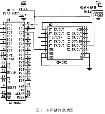 该设计应能保证两个键盘单独工作,而且相互不能影响。因此,不能直接把专用键盘和标准键盘一起接到工控pc的PS/2口。鉴于这种情况,本设计使用模拟开关CD4052并通过时分复用工控pc的PS/2口,来使在同一个时刻只有一个键盘有效,从而解决上述问题。其硬件原理图如图3所示。其中P2口和P1口用于键盘扫描电路(图中未画出),p0.0为数据端,p0.1为时钟端,p0.2为模拟开关选通端。由于专用键盘不需要接收工控pc机的命令,所以软件中并不需要写这部分相应的代码。
