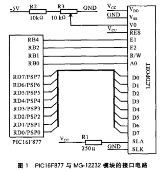 现以功能强、价格低的PIC16F877为例说明PIC与MG-12232模块的硬件接口电路。其接口控制时序采用M6800操作时序,这样 SED1520F0A引出的控制信号R/W,A0,E1和E2由PIC16F877的I/O端口portb的4个脚控制。接口电路如图1所示。图中利用可调电阻R3实现液晶的背光亮度调节,直接用电阻R2驱动液晶的背光灯。由于PIC16F877的位操作指令丰富,所以用软件不难模拟出M6800操作时序。