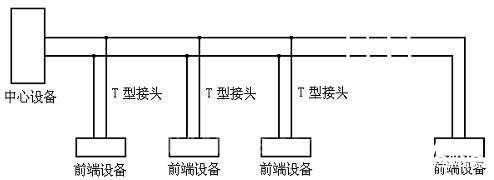 星型连接是电视监控系统中最常用的布线方法(如图1所示),视频线、音频线和大多数报警探头的信号线都采用这种方法。星型连接的优点是施工、维护简单方便;缺点是比较费线。