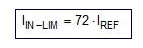 电流限制器内部实现比较器功能,其阈值电流 ITH 与最大输入电流 IIN-LIM 完全相同。利用一个反射系数为 n = 72 的电流镜,通过基准电流 IREF 推导出 ITH。由于 IIN-LIM 与 ITH 相同,因此最大输入电流可以表示为: