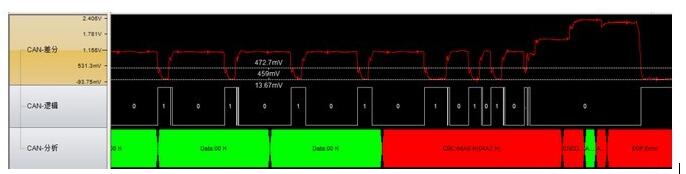 在网络布局无法改变,分支引起的信号反射必须存在的情况下。最实用的方法就是在长分支末端加上电阻,消除信号反射。同样的在上述实验中,在分支节点处加上一个200Ω的电阻,其它条件不变进行通信实验。下图为实验的CAN波形图,此时可以看到边沿台阶已被消减,但是加了电阻之后差分电压变小,注意差分电压不得小于0.9V。这里值得一提的是:阻值大于500Ω的电阻吸收反射的能力很弱,所以在末端挂电阻的时候应小于500Ω。