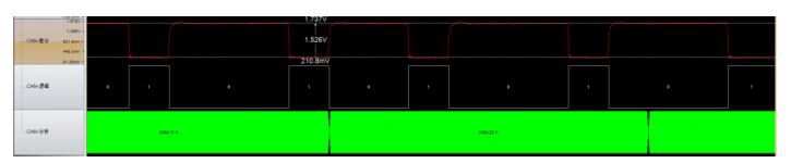 在讲CAN支线之前,我们来看一个CAN的波形图,如下图所示,大家仔细查看CAN波形图,会发现CAN波形上存在明显的上升沿和下降沿台阶现象,因为台阶的存在,从而引起波特率变化,导致接收节点采样出错(也称位宽错误)。