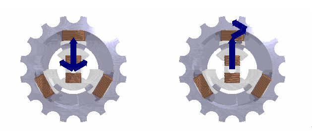 是电机自己完成这项工作的。在电机壳体上有一对180°分开的电刷,这对电刷通过两个换向器触点(金属板)将施加的电流引导到电枢线圈上; 每个金属板覆盖近180°的电枢。当电机转动时,电源,电刷,换向器金属板和两个电机线圈(绕组)之间的电流回路每转半圈就自动切换一次。电枢的磁场与转子的磁场相互作用,转子的磁场可以通过电机本体上的固定线圈产生,也可以通过永磁体产生。当转子转动时,其磁场方向也要反转,从而电机保持转动,因为线圈产生的磁场的方向是一直切换的,并且被外部线圈或永磁体产生的磁场吸引/排斥。