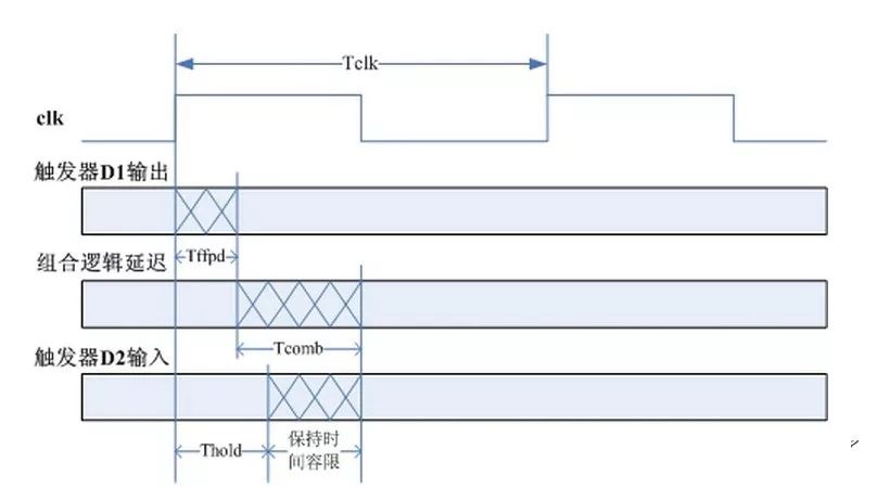 由上图可知,保持时间容限+Thold=Tffpd(min)+Tcomb(min),所以保持时间容限=Tffpd(min)+Tcomb(min)-Thold,根据保持时间容限≥0,也就是 Tffpd(min)+Tcomb(min)-Thold≥0。