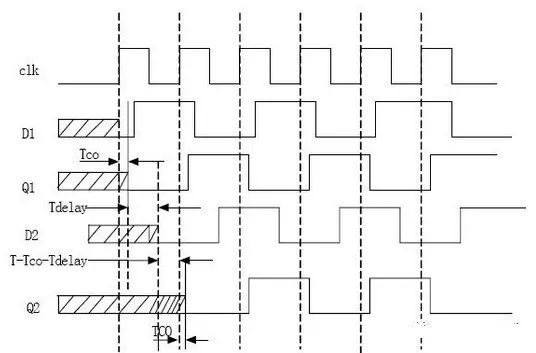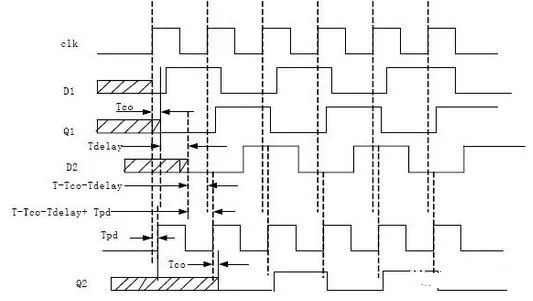 从图5中可以容易的看出对建立时间放宽了Tpd,所以D2的建立时间需满足要求: