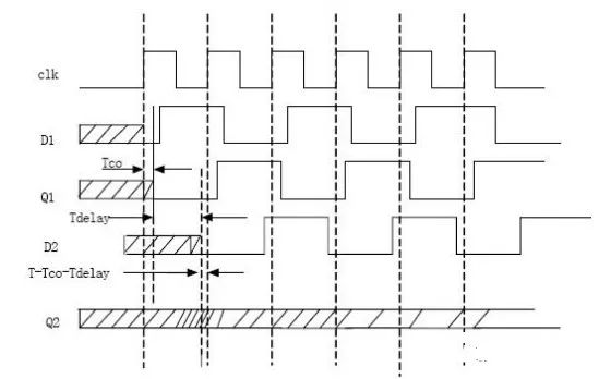 如果组合逻辑的延时过大使得T-Tco-Tdelay 那么将不满足要求,第二个触发器就在第二个时钟的升沿将采到的是一个不定态,如图4所示。那么电路将不能正常的工作。