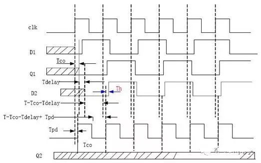 从上面的时序图中也可以看出,D2的建立时间与保持时间与D1的建立与保持时间是没有关系的,而只和D2前面的组合逻辑和D1的数据传输延时有关,这也是一个很重要的结论。说明了延时没有叠加效应。
