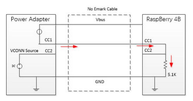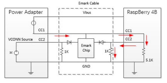但是,USB TYPE-C规范里面,还规定了一种带Emark 芯片的Cable,这种Cable的CC2上,有一个1K的下拉电阻,用来告知DFP端的CC识别芯片,需要往CC2上提供VCONN Source。一旦跟这样的Cable连接起来,RaspBerry 4 Pi model B就会出现严重问题。因为CC1和CC2连接起来后,会跟Cable上的1K到地电阻并联,形成一个比1k电阻还小的阻抗,从而满足了USB-C规范中Audio Adapter Accessory Mode的连接规范,被电源端误认为是一个模拟耳机设备,从而拒绝供电。
