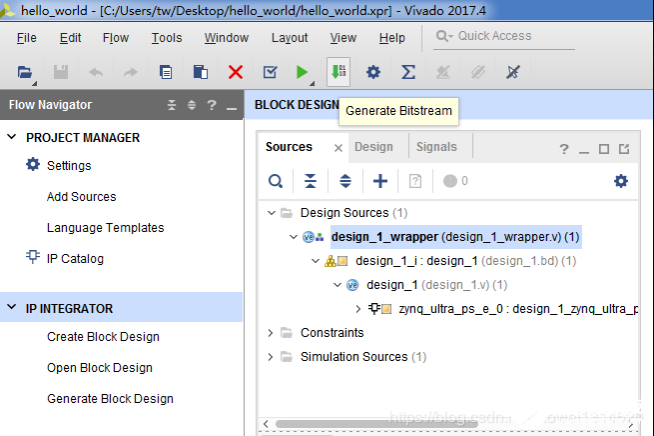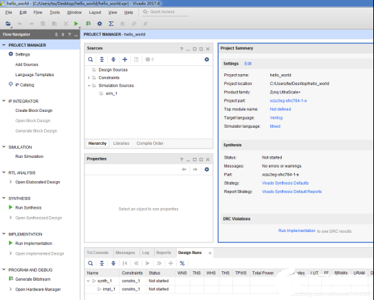 点击Next进入下一步,填写工程名和选择工程保存路径,点击Next。继续往下,按照截图的配置选择开发板型号为 xczu3eg-sfvc784-1-e ,点击Next,点击Finish。新建的vivado工程,如下图所示