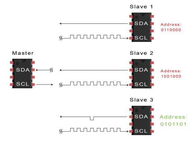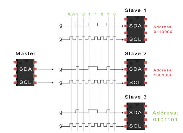 2、主设备向每个从设备发送它想要与之通信的从设备的7或10位地址,以及读/写位: