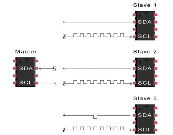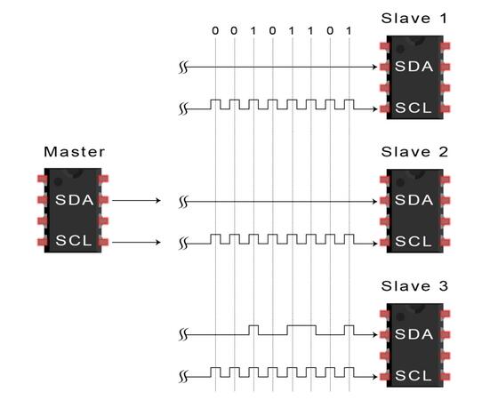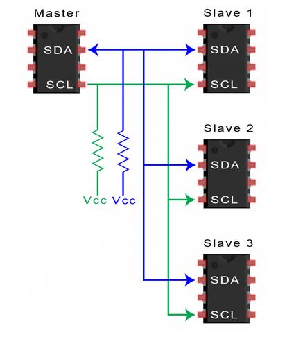 由于I2C使用寻址,因此可以从单个主设备控制多个从设备。使用7位地址,可以使用128(27)个唯一地址。使用10位地址并不常见,但提供1,024(210)个唯一地址。要将多个从器件连接到单个主器件,请像这样连接它们,使用4.7K欧姆上拉电阻将SDA和SCL线连接到Vcc: