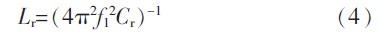 当f1 一定时,Cr 越小,Lr 越大,Q 越大,增益曲线的斜率越大,故减小Cr 可使半载的工作频率显著降低。从提高半载效率的角度考虑,Cr 越小越好,但Cr 越小,其两端的电压峰值则越大,要降低Cr 的电压应力,Cr 应取越大越好。设计中应该折中考虑。Cr 确定后,根据f1 可计算出Lr 为: