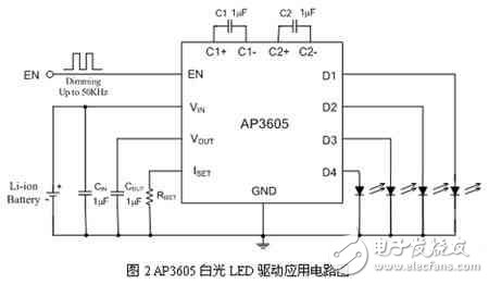 图2即是由AP3605设计的典型白光LED驱动电路,由单节锂电池供电,除AP3605外,仅由低成本的5个外围器件组成。