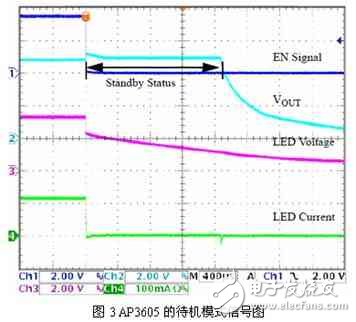 AP3605通过内部的Standby模块实现了高达50KHz的调光频率。而且不会引起浪涌电流。如图3所示,当EN脚变低时,电荷泵的输出Vout延迟约1.7ms再关断,但恒流源会跟随EN信号马上关断,LED电流变为0;而当EN信号为高时,恒流源会跟随EN信号马上打开,由于Vout仍正常工作,LED电流立即变为20mA。因此当PWM的调光频率高于1KHz时,AP3605能通过EN信号直接快速的调节LED电流,从而实现高频率PWM调光。