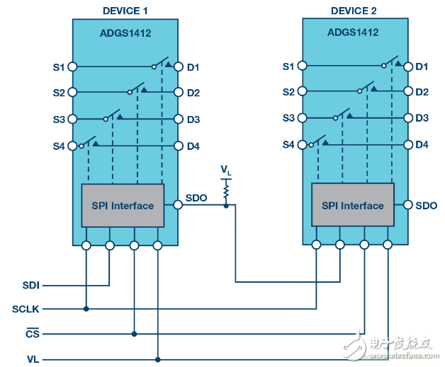 如上所述,ADI SPI开关能以菊花链模式工作。采用菊花链配置的ADGS1412器件连接如图5所示。所有器件共享CS 和SCLK数字线路,而器件的SDO与下一器件的SDI形成连接。利用单个16位SPI帧指令菊花链中的所有器件进入菊花链模式。在菊花链模式下,SDO是SDI的8周期延迟版本,故期望的开关配置可以从菊花链中的一个器件传递到另一个器件。