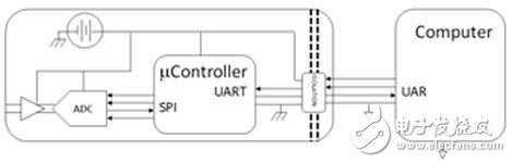 超低功耗的第三个应用示例是为持续时间较长的电池供电应用提供支持。面向家庭健康监护的医疗器械(如血糖仪、脉搏血氧仪)必须采用特殊结构,以在接触病人的同时,还能连接非医疗极计算机。必须为串行接口供电,并在连接计算机时,能唤醒设备,因此,待机电路中应采用有源隔离器。在这种情况下,利用ADuM1441的刷新禁用功能可以使器件的电池能耗降至4μA以下。这一功耗水平非常低,即使一枚纽扣电池,也可以使待机电流维持数年时间。