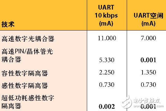 表1.隔离器每通道功耗比较(VDD=3.3V,100kbps)