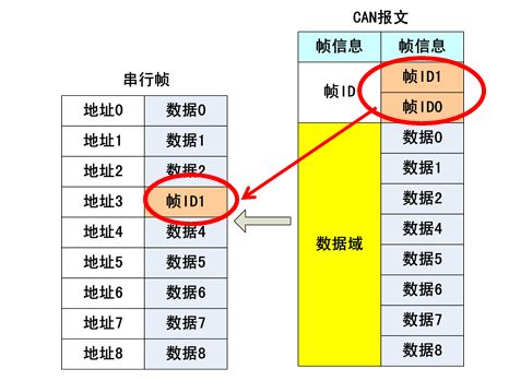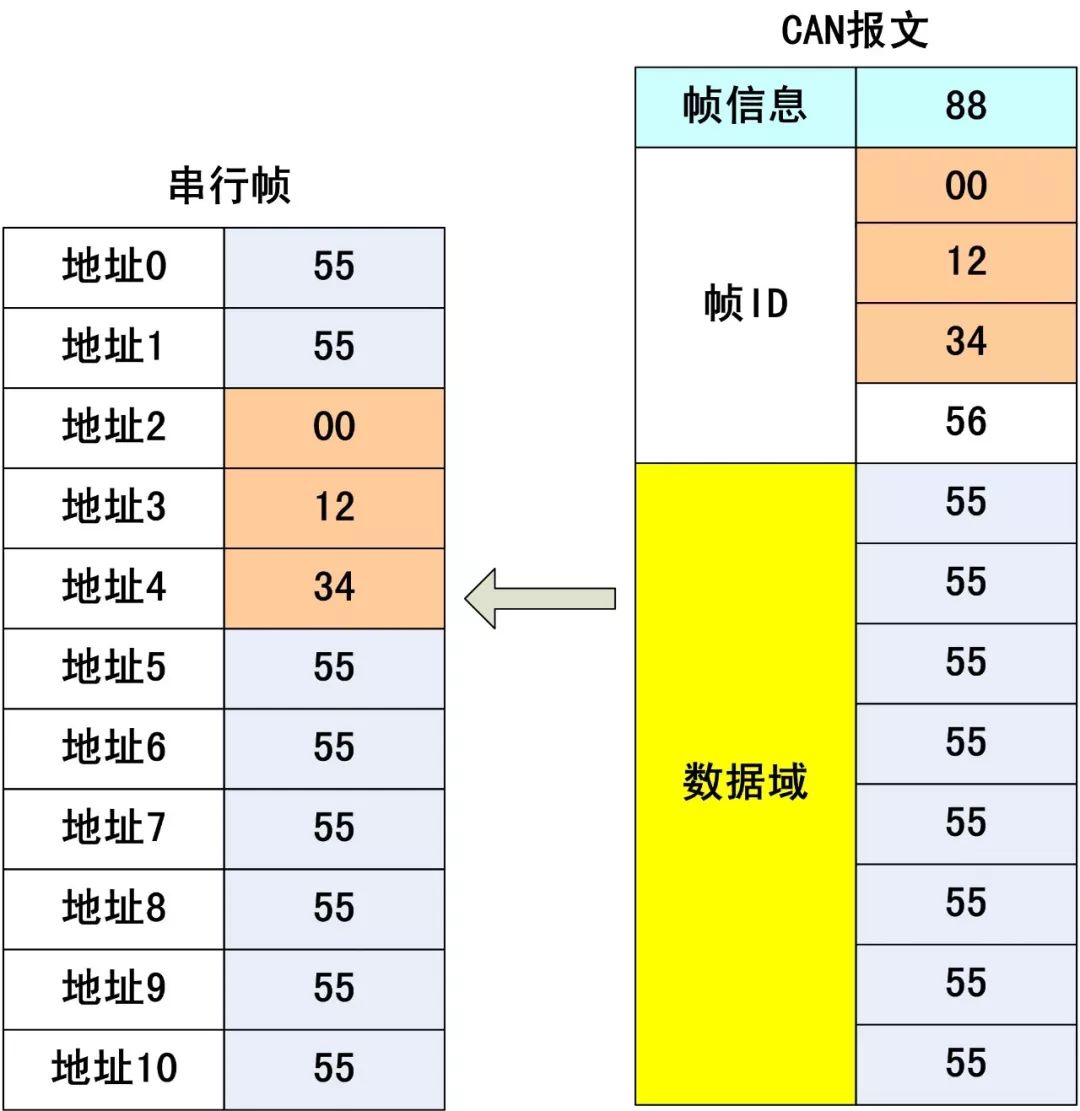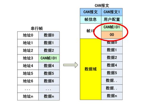 该转换模式串行帧中的“帧ID”自动转换成CAN报文中的帧ID。只要在配置中告诉模块该“帧ID”的地址编号在串行帧的起始位置和长度,模块在转换时提取出这个“帧ID”填充在CAN报文的帧ID域里,作为该串行帧转发时的CAN报文的帧ID。在CAN报文转换成串行帧的时候也把CAN报文帧ID转换在串行帧的相应位置。