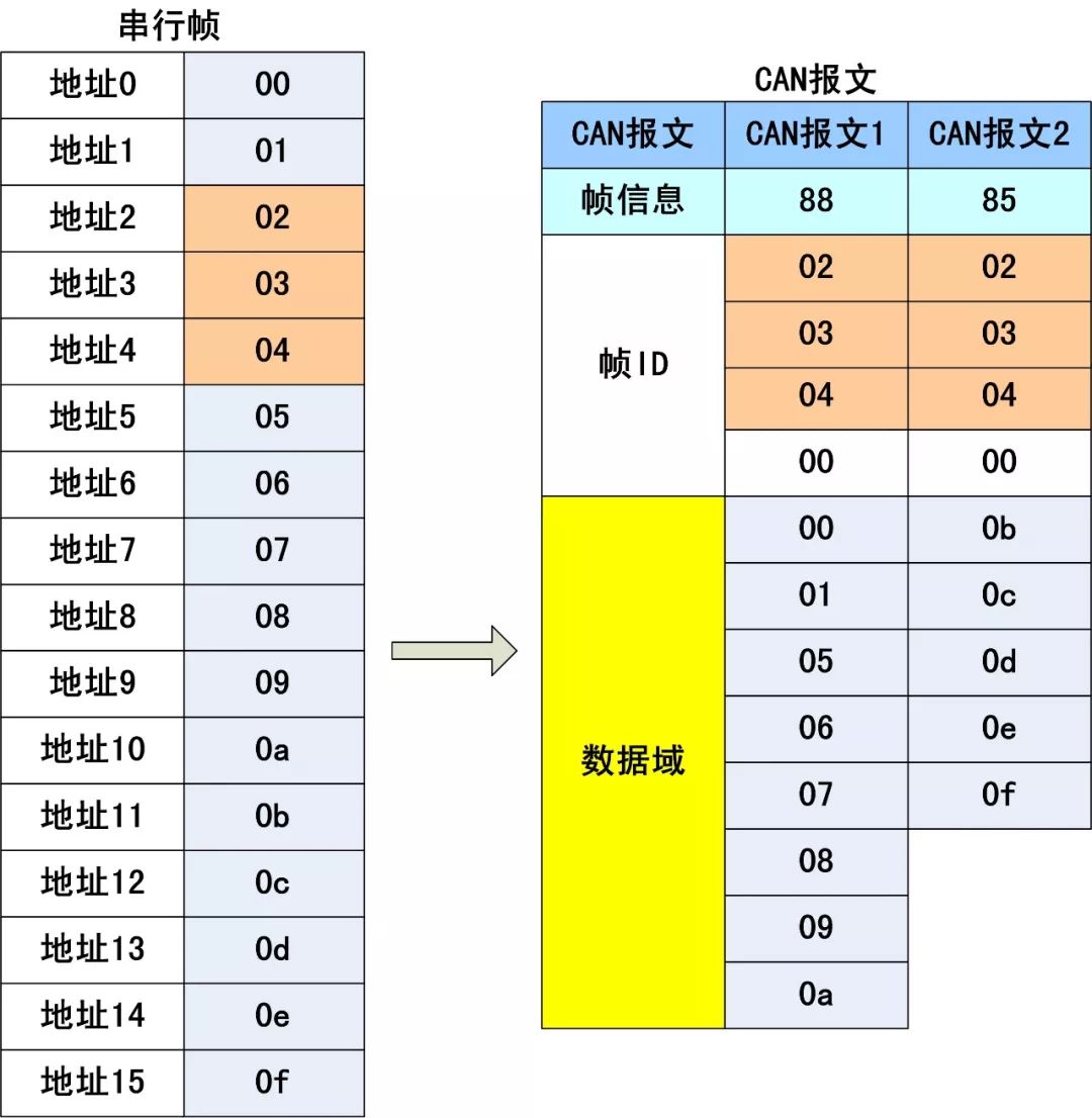 假设CAN报文“帧ID”在串行帧中的起始地址是2,长度是3(扩展帧情况下),串行帧发送的数据分别为0x00,0x01,0x02,0x03,0x04,0x05,0x06,0x07,0x08,0x09,0x0a,0x0b,0x0c,0x0d,0x0e,0x0f,则转换结果如图7。
