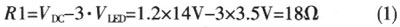 驱动超高亮度Luxeon LED的最简单方案是采用图l所示的桥式整流电容器滤波电路。电源降压变压器次边输出为14Vac(Vin),桥式整流滤波电路输出电压VDC=1.2Vin。LXHL-MWlD型Luxeon LED的正向工作电流ILED=350 mA,正向压降(@350 mA)VLED=3.5 V。