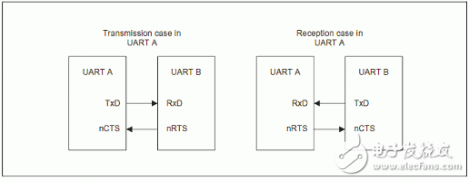 在自动流控(AFC)模式下nRTS取决于接收端的状态,而nCTS控制了发送断的操作。具体地说:只有当nCTS有效时(表明接收方的FIFO已经准备就绪来接收资料了),UART才会将FIFO中的资料发送出去。在UART接收资料之前,只要当接收FIFO有至少2-byte空余的时候,nRTS就会被置为有效。图5-12是UART 自动流控模式的连接方式