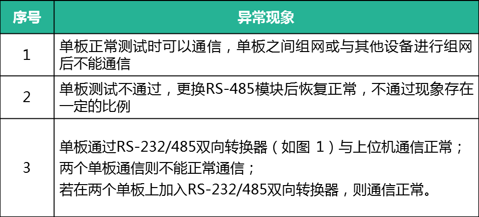 表2现象1分析:单板可以正常通信,组网后由于RS-485总线上接有终端电阻,导致空闲状态时总线差分电压处于门限电平之内,出现通信异常。当出现上述情况时,首先需确认总线上是否存在终端电阻。