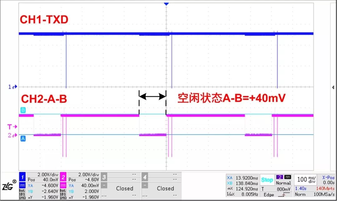 表2现象2分析:单板测试时,单板或与之通信的设备接有终端电阻,此时AB之间差分电压处于门限电平之内时,有一定概率出现通信异常。