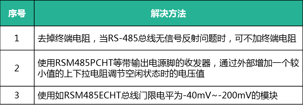 若RS-485总线上接有终端电阻,且所用RS-485收发器门限电平是±200mV,则可能出现表2中所述的异常现象。