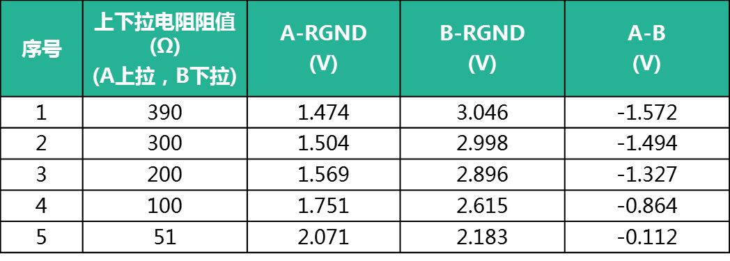 上述问题是所加上下拉电阻值较小导致的问题,超过了芯片可以驱动的负载能力。RSM485PCHT在AB之间加两个120Ω电阻后,所加上下拉电阻值与输出差分电压低电平的关系如表 5所示,当上下拉电阻并联值小于51Ω时,虽然芯片可以正常输出,但是输出信号已大于-200mV,此时可能出现通信错误或完全不能通信。上下拉电阻过小会导致RS-485收发器在功耗过大,发热严重,有可能导致收发器过热保护或者损坏,因此为了保证通信的可靠性,上下拉电阻阻值不宜过小,一般上拉或下拉电阻的并联值应大于375Ω。