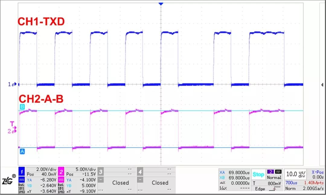 在通信异常时,测量RS-485总线AB差分电压与模块TXD、RXD引脚之间波形的对应关系可以判断异常位置。使用图4所示的测试方法得到如图5所示波形,TXD为高电平时,A-B为高电平,TXD为低电平时,A-B为低电平,并且模块输出电平正常,可以判断出模块发送功能正常。