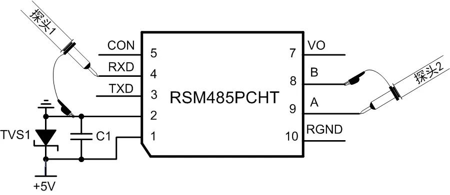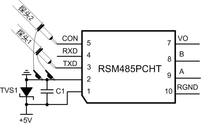 RS-485收发器AB引脚的共模电压范围一般要求在-7V~+12V范围内,当超过此范围内时会造成芯片损坏。由于工业现场大地经常会流过瞬时大电流,若收发器RGND引脚连接不当,则AB引脚的共模电压会超过其可承受的共模电压范围,导致模块损坏。下面以RSM485PCHT为例进行分析。